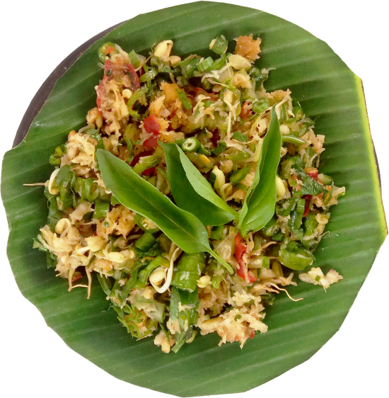 It is consisted of chopped raw vegetables such as cucumber, long bean, cabbage, and short bean sprouts. They are blended well with peanut sauce. Combination of sweet and spicy dominates its taste.